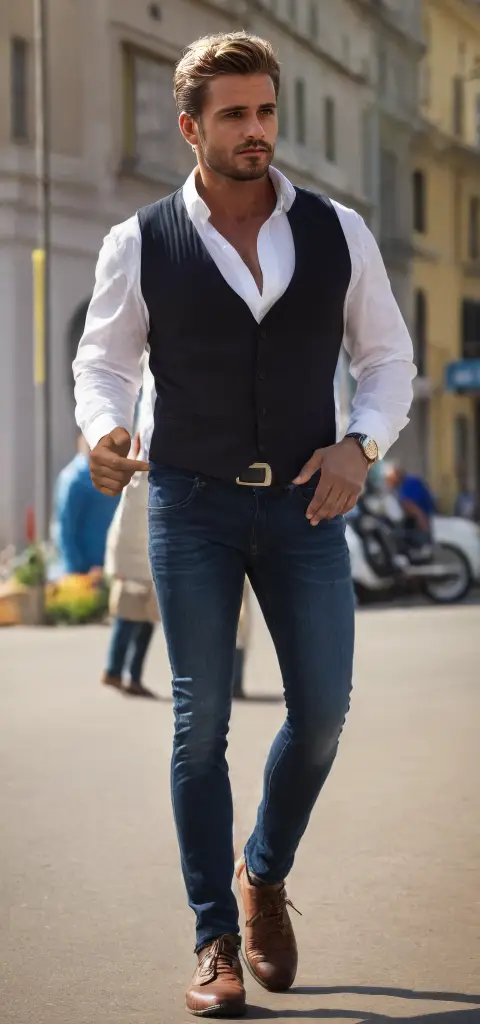 Bold, refined, and effortlessly stylish—this outfit is the perfect balance of classic tailoring and contemporary cool. The fitted navy waistcoat, paired with an open-collar white linen shirt, exudes timeless sophistication with a relaxed edge. Slim-fit dark denim adds a modern touch, while the sleek leather belt and polished brown boots complete the look.